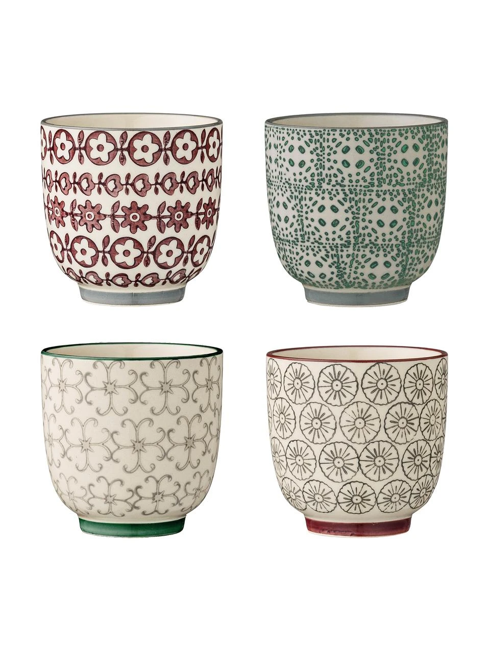 – 4 kleine Becher mit geringer Füllmenge in unterschiedlichen Farben und Designs