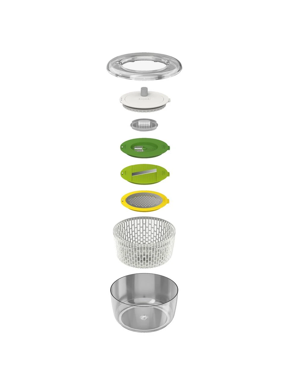 – Bestehend aus 4 austauschbaren Scheiben für verschiedene Aufgaben: Salatzubereitung, Salatschleudern, Spiralschneiden, Reiben und Schneiden