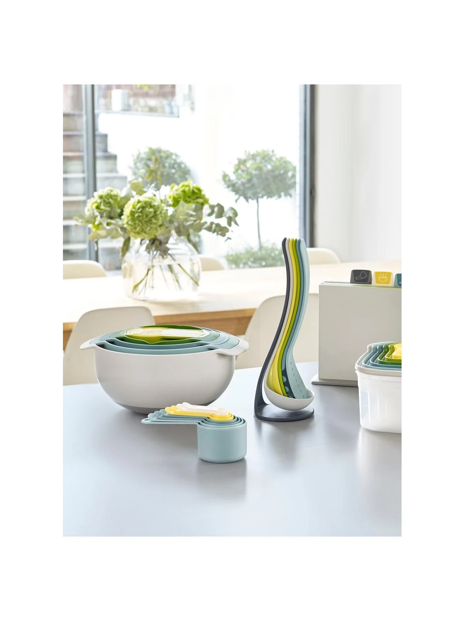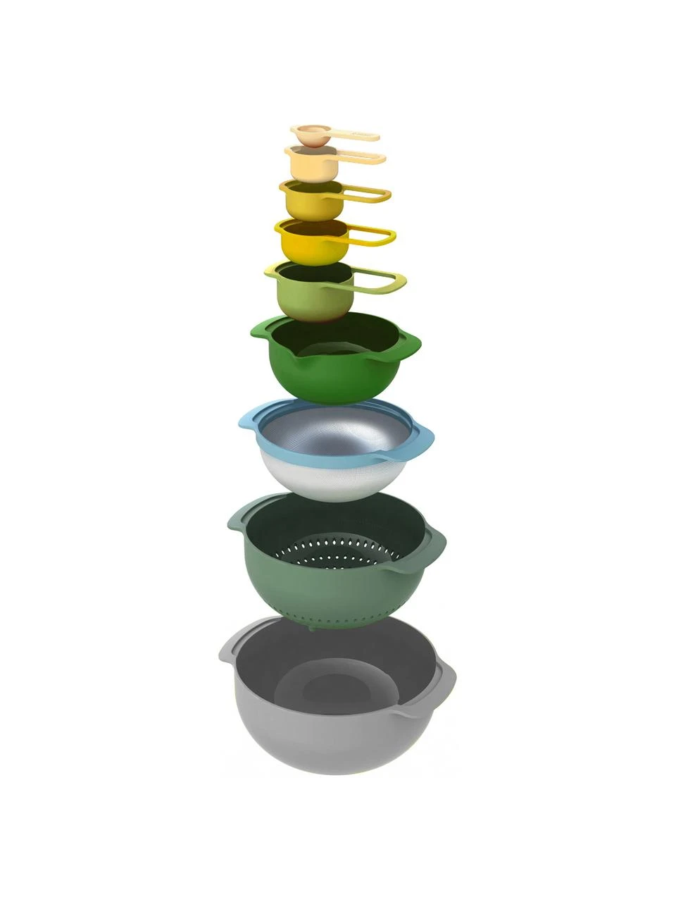 – 9-tlg. Set bestehend aus 5 Messbechern, 2 Rührschüsseln und 2 Küchensieben (1 Durchschlagsieb und 1 feinmaschiges Edelstahlsieb)