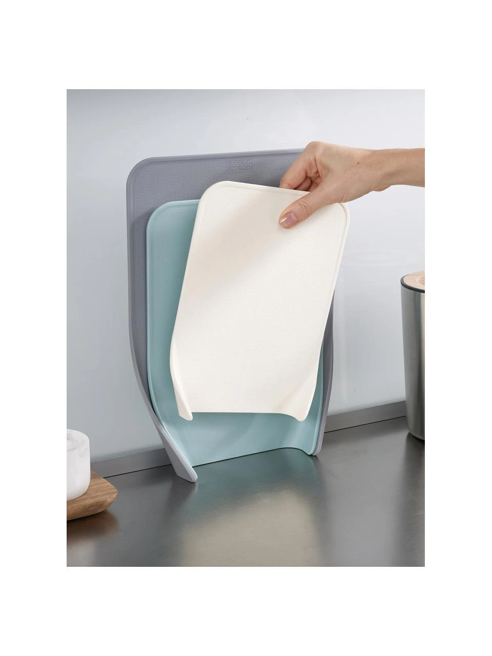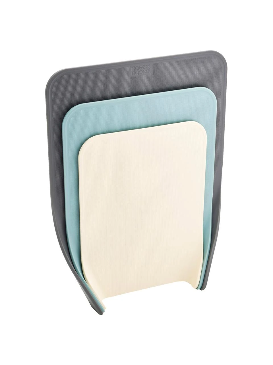 Die Bretter können platzsparend zusammengesteckt werden und freistehend auf der Arbeitsplatte aufbewahrt werden.