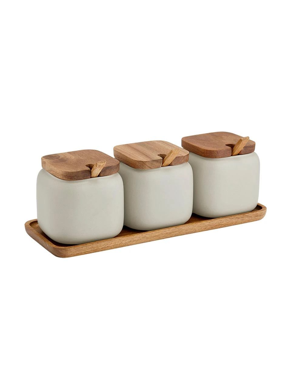 7-tlg. Set bestehend aus 3 Aufbewahrungsdosen je mit Deckel und Löffel und 1 Tablett