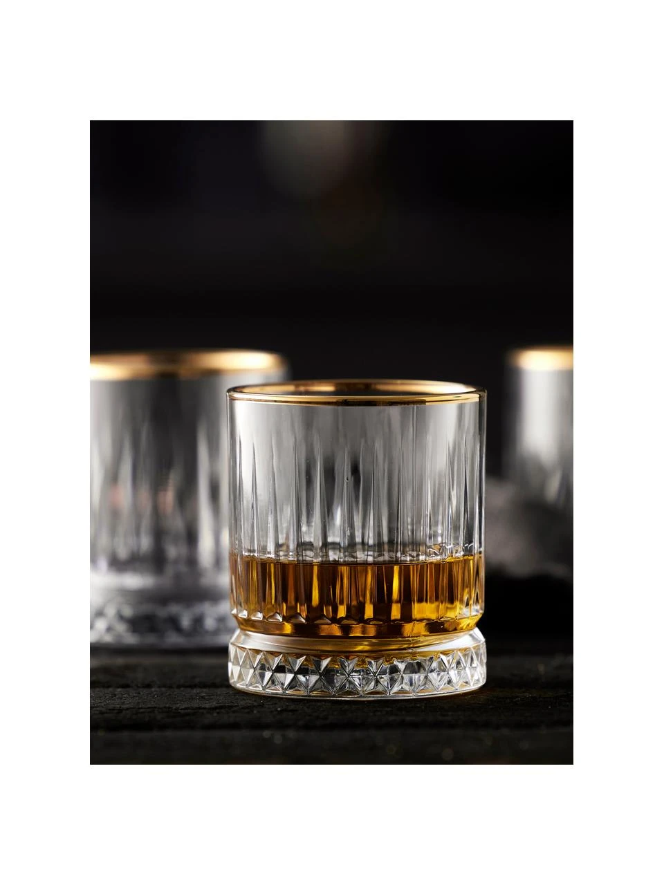 Schaffen Sie eine gehobene Atmosphäre und servieren Sie Ihr Lieblingsgetränk in feinsten Whiskygläsern mit Goldrand. Die schöne Kollektion Firenze hat mit ihrer eleganten Silhouette, ihren Facetten sowie dem feinen Goldrand, der den Gläsern eine glamouröse Note verleiht, einen exklusiven Look.