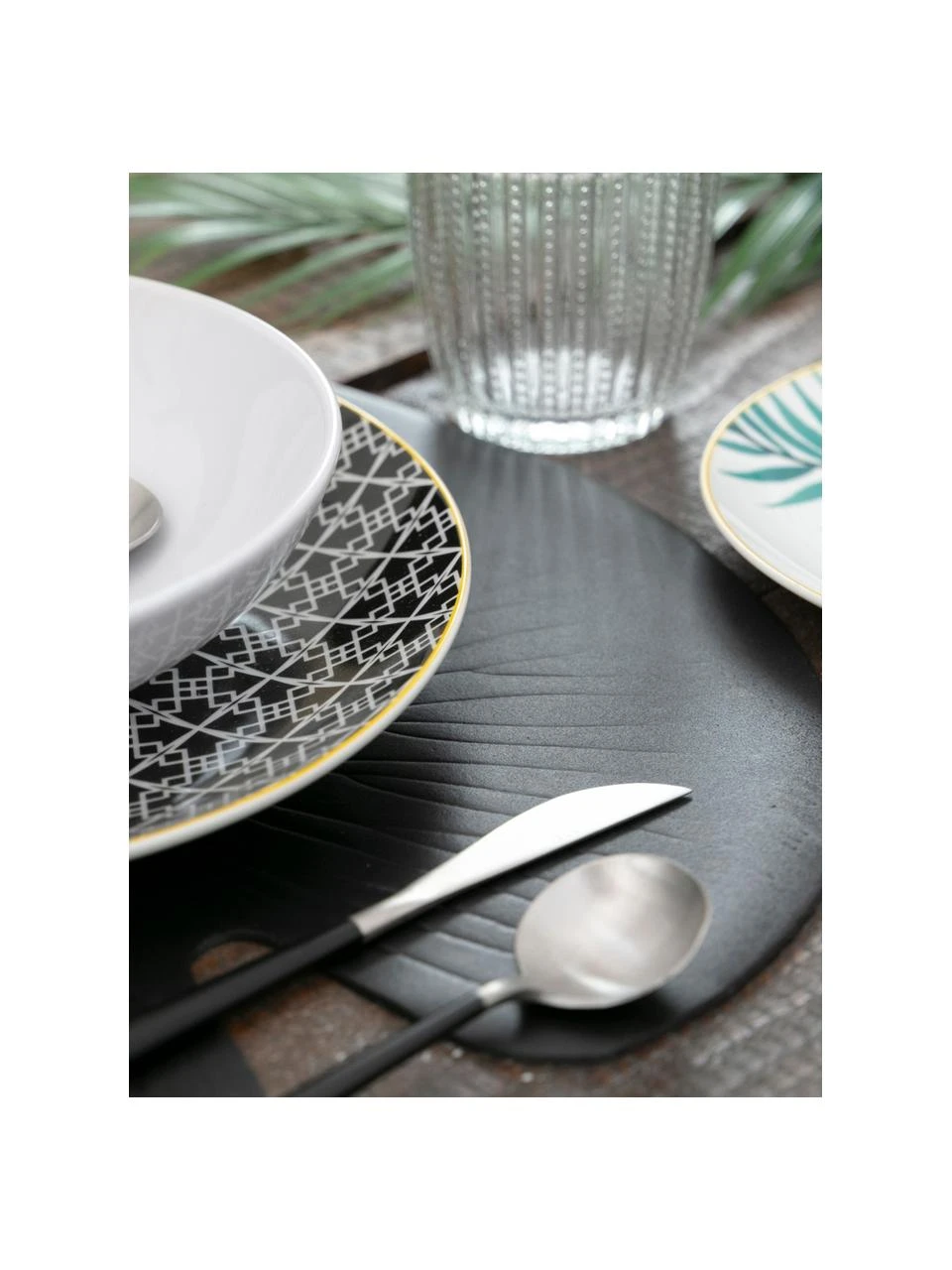– Bestehend aus 6 Speisetellern, 6 Suppentellern und 6 Desserttellern in unterschiedlichen Farben und Designs