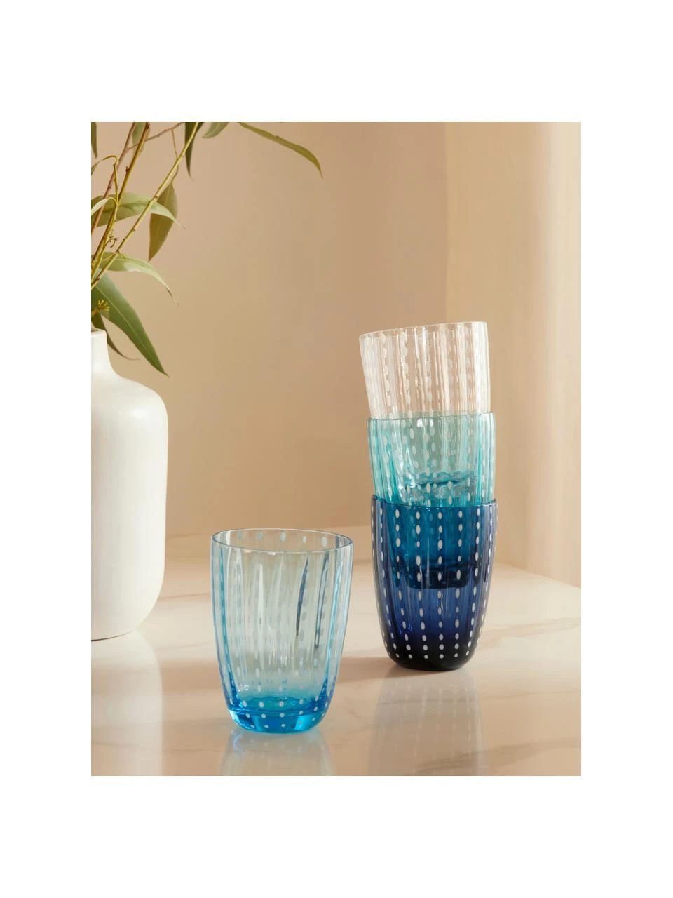 6 Wassergläser in unterschiedlichen Blautönen