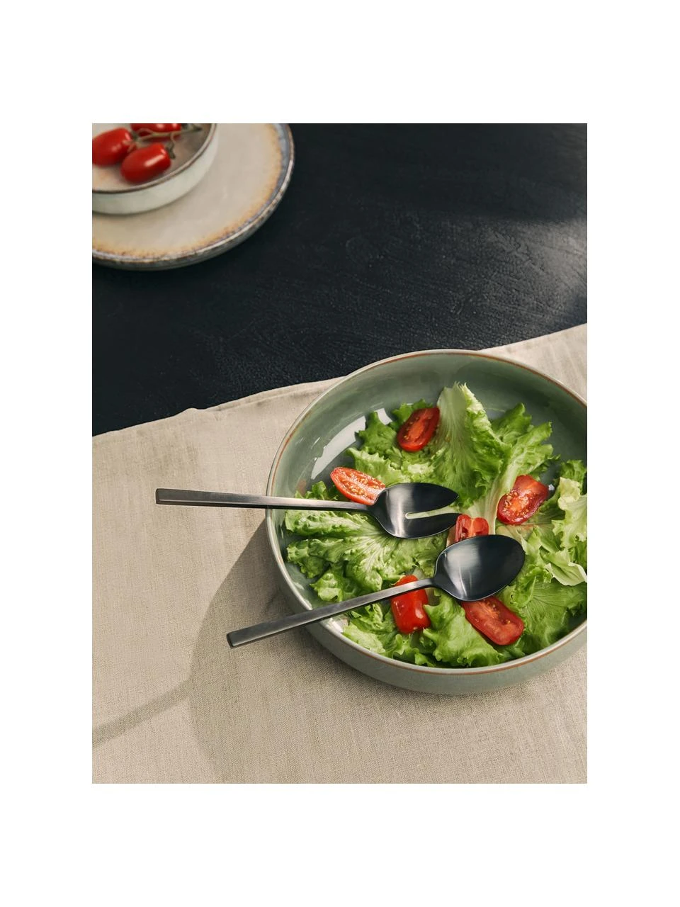 Dank seiner seidig schimmernden Mattierung und der modernen Farbe Schwarz hinterlässt das Salatbesteck Shine einen bleibenden Eindruck.