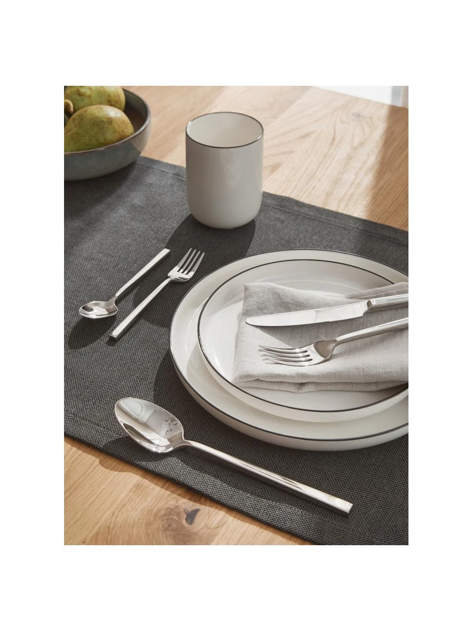 Klare Konturen und das klassische Design prägen den Charakter. Gleichermaßen schlicht wie elegant. Die markanten Formen der langen schlanken Griffe liegen angenehm schwer und hochwertig in der Hand.