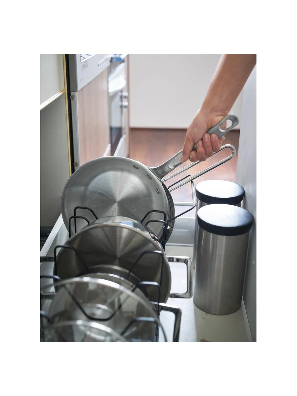 – Ausziehbarer Kochgeschirrhalter mit 10 Trennblättern